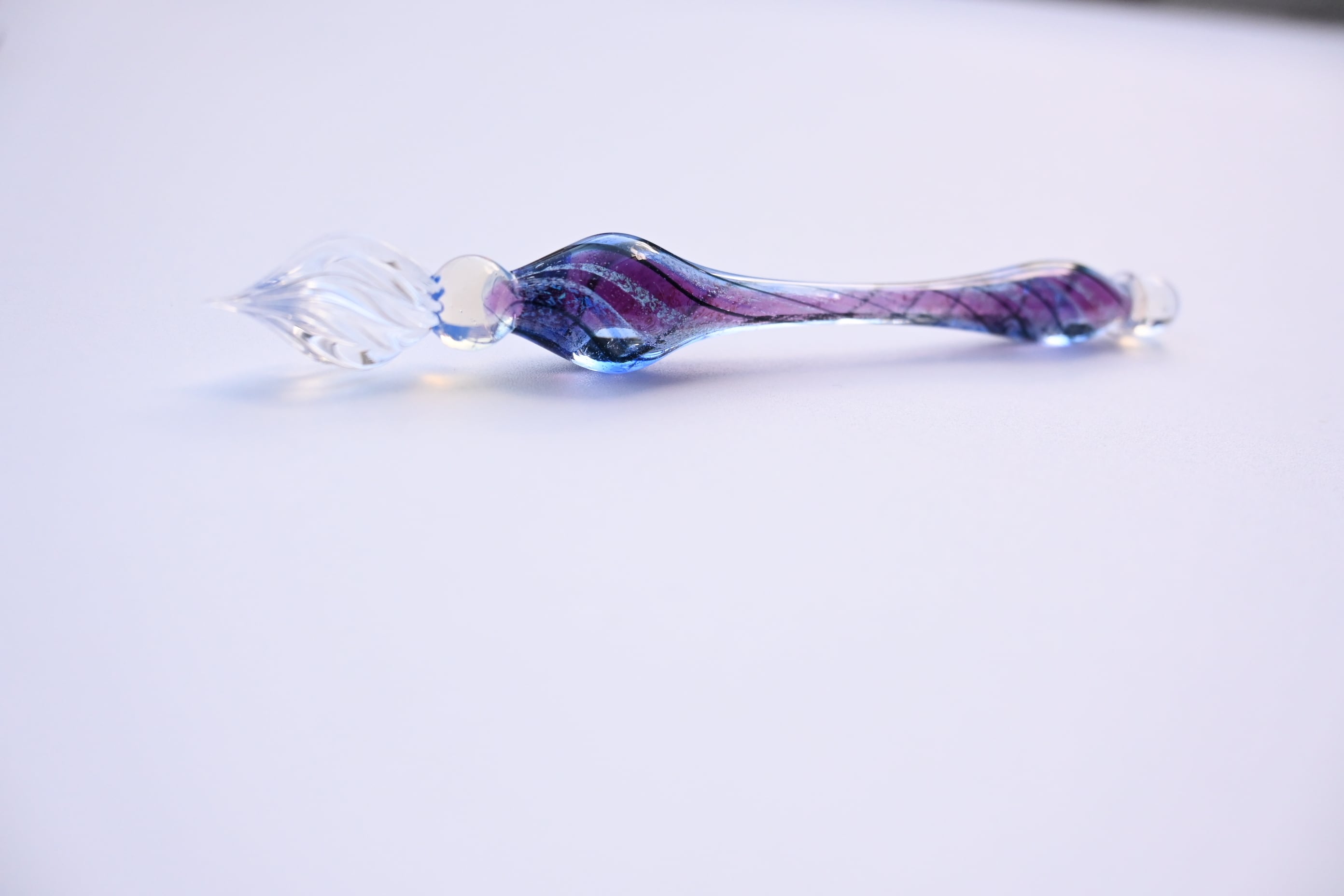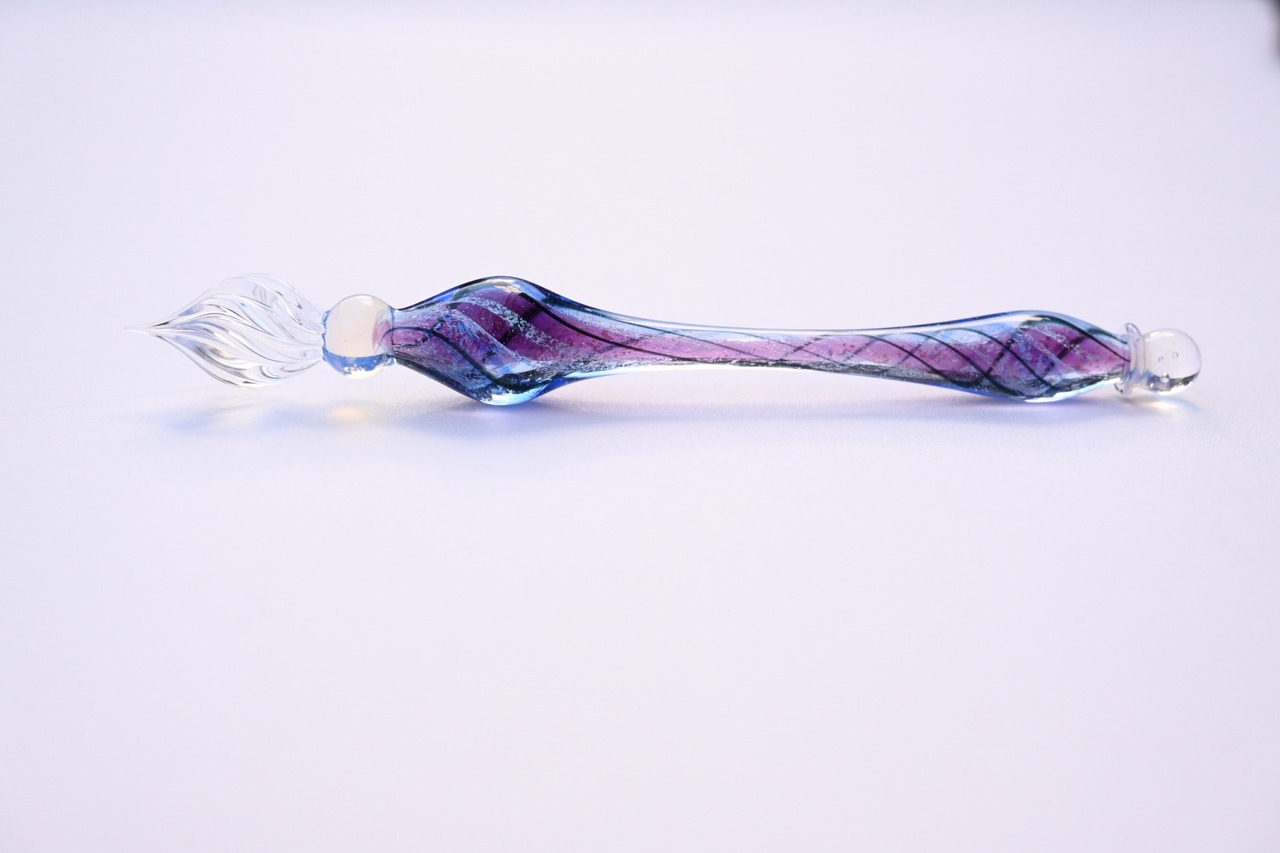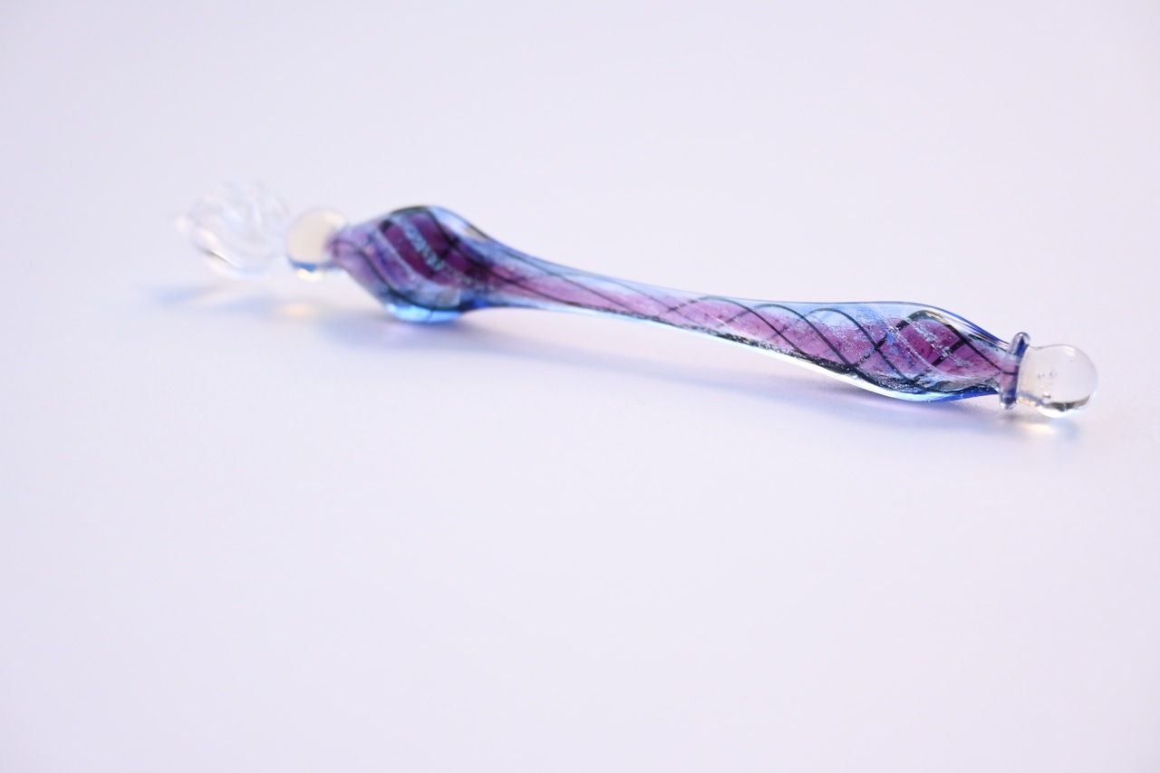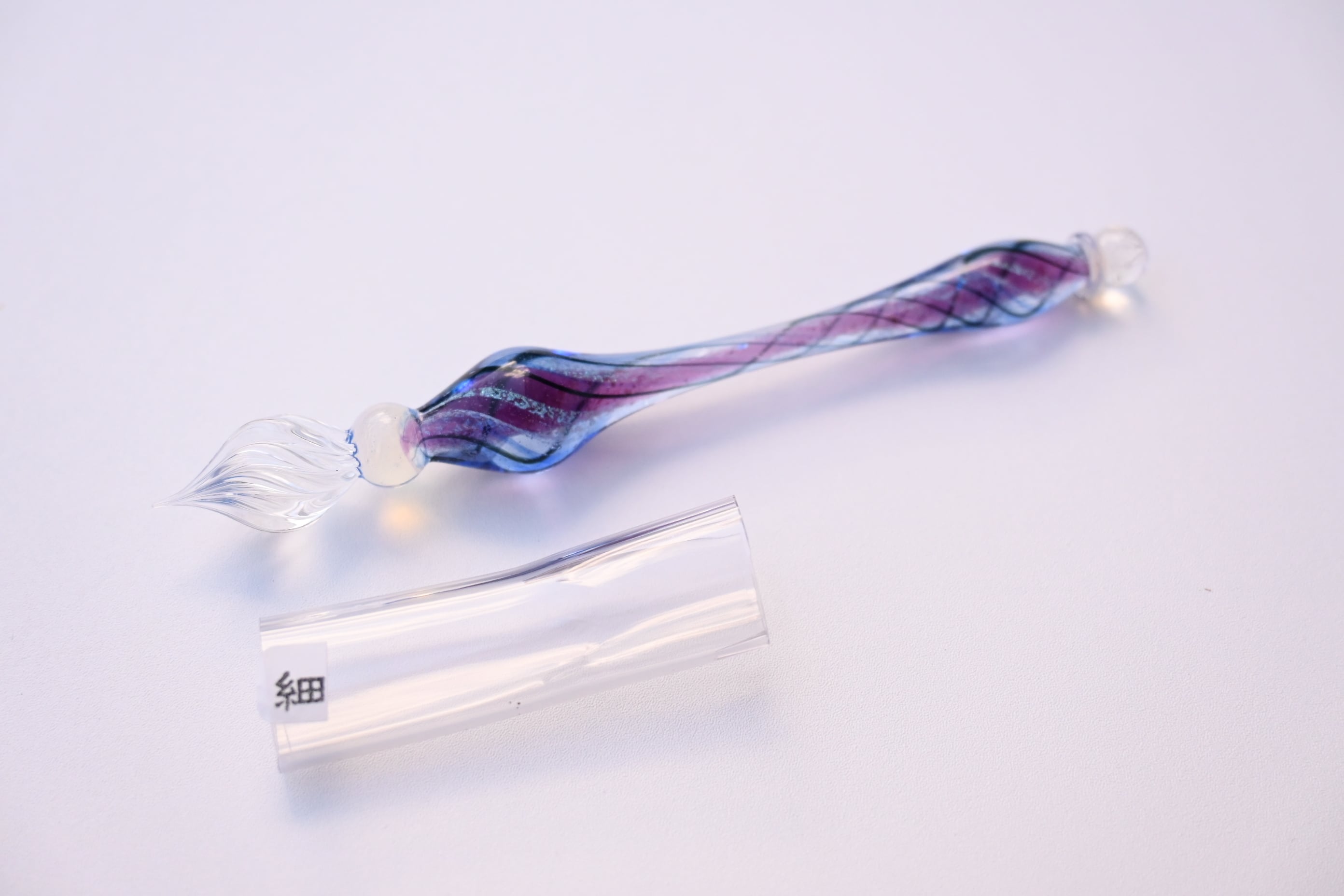 濃い紫色を中心にブルーの色ガラスとたっぷりのラメが輝くガラスペン。